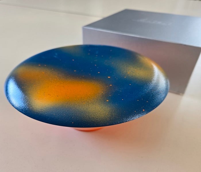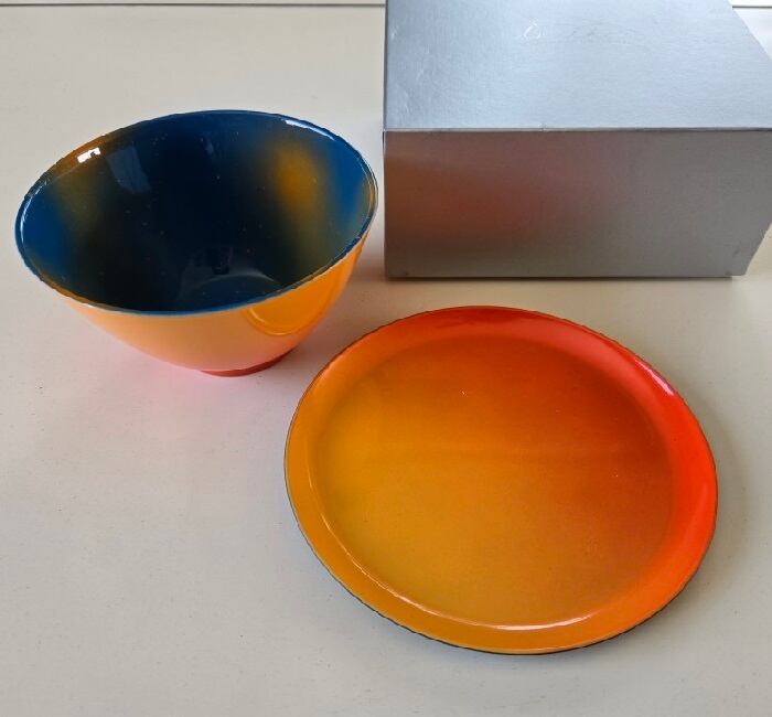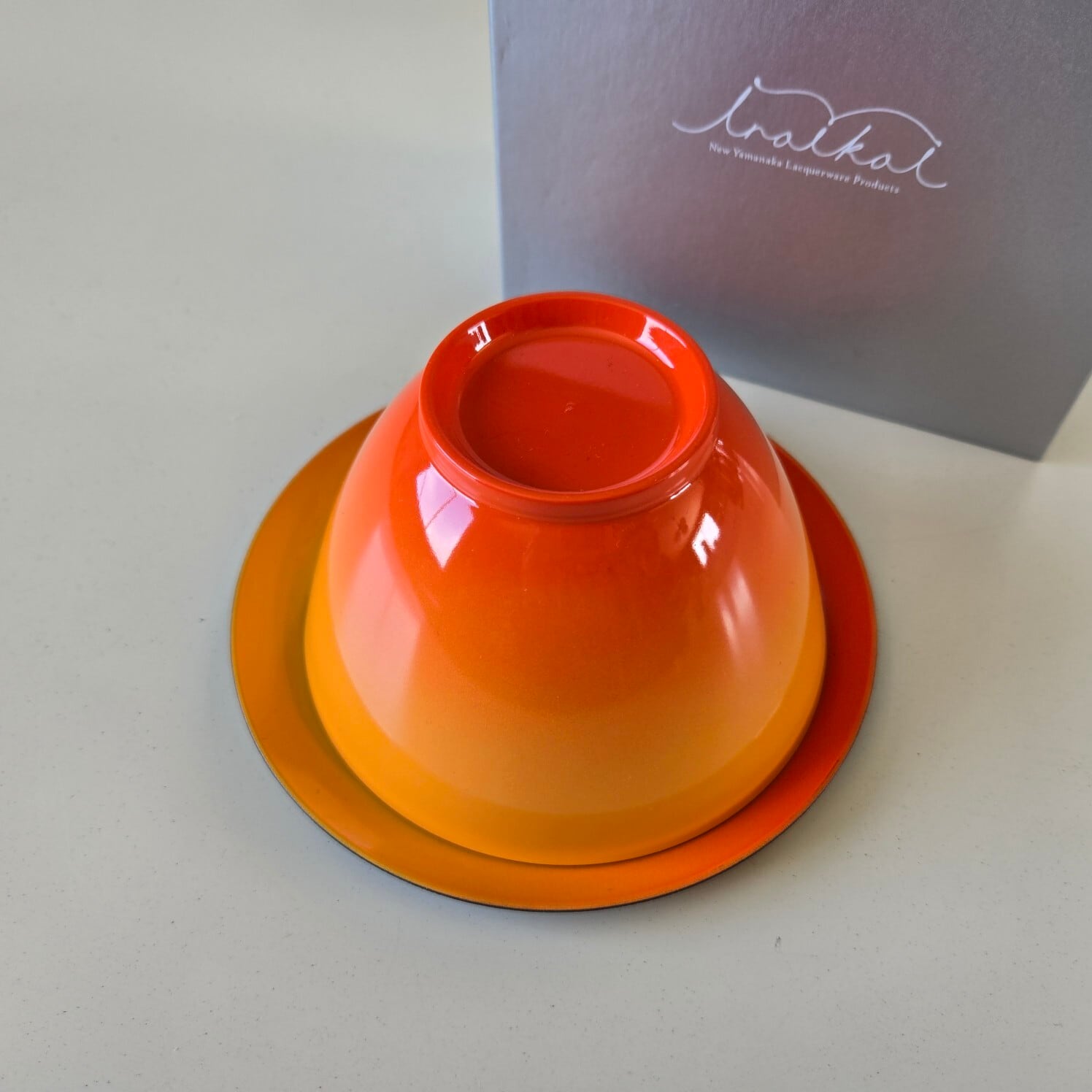 iroikoi カフェオレボールセット 晩夏は、山中漆器の伝統技術を活かし、加賀市の海岸・加佐の岬から見た夏の夕日をモチーフにした景色のデザインが施されたカフェオレボールとケーキ皿のセットです。4.0フリーボウルと5.0平皿が組み合わさった魅力的なセットは、日常の食卓やカフェタイムに特別なひとときを演出し、まるで過ぎゆく夏が感じられる晩夏の美しい風景を楽しんでいるかのような気分にさせてくれるでしょう。