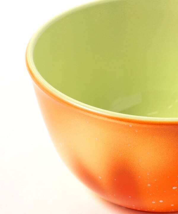 石川県加賀市山中温泉の景勝地である鶴仙渓の新緑の木々の中に立つ川床の傘が混ざりあったデザイン。内側は黄緑のグラデーション、外側は赤や橙に白い斑点の変わり塗で、侘び寂びを感じる手付きのカップ。吹き付け塗装で職人が一つ一つ手作業で塗重ねられ、食洗機や電子レンジにも対応。サイズ:146×125×65mm、素材:PET/ABS樹脂、塗装:ウレタン塗装抗菌クリアー、専用化粧箱入り。